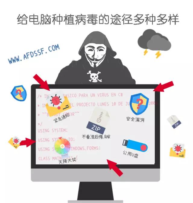 實際上,病毒入侵的方式很多,電子郵件、瀏覽網頁、下載軟件、即時通訊軟件、網絡游戲、公用U盤等都有可能成為病毒傳播的途徑。