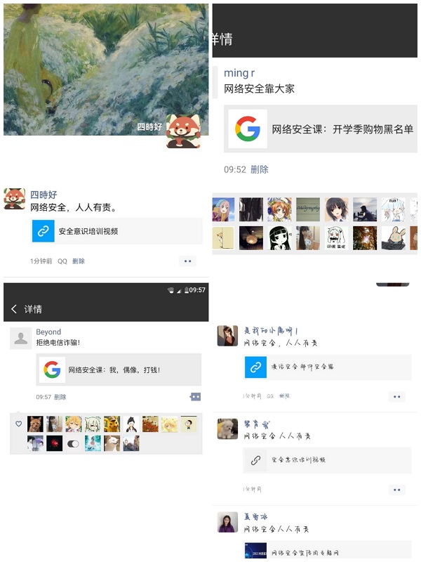 通過學院QQ、微信、易班平臺,動員學生轉發網絡安全宣傳視頻,并參與#平安校園#微博話題。讓每位學生都做網絡安全的守衛者。