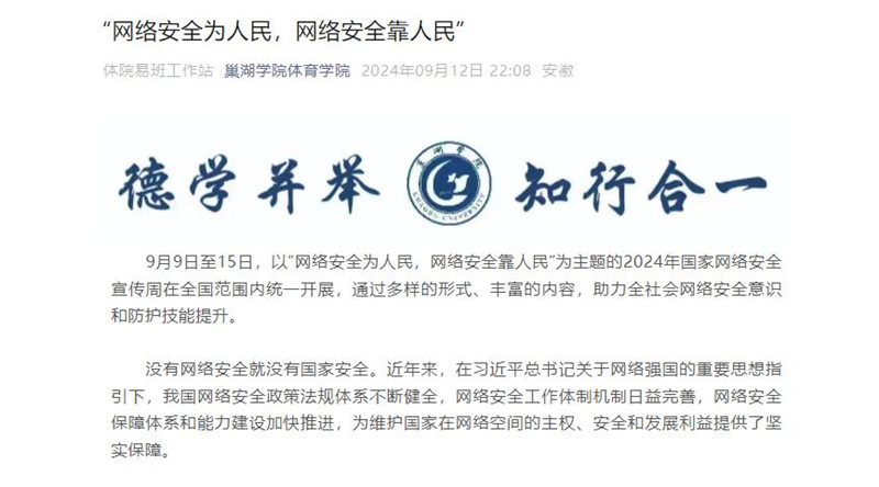 活動期間,學院充分利用“兩微一端”等傳播渠道,發布網絡安全相關知識。體育學院公眾號通過推文普及網絡安全法律法規、防電信詐騙等知識。