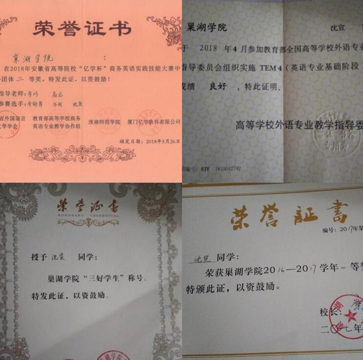 沈宣,女,漢族,巢湖學院外國語學院2016級商務英語專業2班學生,特長二胡,達到十級水平。曾獲得巢湖學院“三好學生”稱號,巢湖學院一等和三等獎學金。2019年獲得全國大學生英語競賽特等獎,安徽省“億學杯”商務英語技能大賽”二等獎,巢湖學院新生才藝大賽二等獎。獲得BEC高級證書,專四成績良好,四級取得612高分,六級550分。