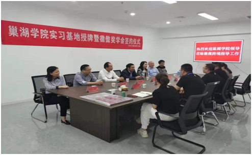 2021年5月12日,副校長徐柳凡、副校長朱定秀率校辦主任張連福、外國語學(xué)院黨委書記單自華、院長柯應(yīng)根、副院長余榮琦等一行赴安徽徽傲電子商務(wù)有限公司開展深入調(diào)研,為新建實(shí)踐教學(xué)與就業(yè)創(chuàng)業(yè)基地掛牌并舉行“徽傲”獎學(xué)金簽字儀式。徽傲電子商務(wù)有限公司董事長潘驥風(fēng)、副董事長顧維東、黃濤、財(cái)務(wù)總監(jiān)武霖,熱情接待了巢湖學(xué)院一行。受潘驥風(fēng)委托,掛牌暨獎學(xué)金簽字儀式由外國語學(xué)院黨委書記單自華主持。