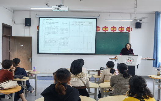 會議伊始,方靈芝老師介紹了大學英語課程教學大綱中課程目標的設定,及其對畢業要求的支撐度。她指出課程教學要以所教授專業的課程大綱為依據,遵循OBE理念,嚴格按照大綱中課程目標開展課程教學,并將課程目標點切實地落實到課程的作業、測試和考查等各個考核環節。同時,她對課程考核內容、評價依據和考核比例設定進行了詳細說明,強調課程教學活動中,需按照大綱中規定的考核比例布置和實施過程性考核,妥善記錄各部分的考核成績,便于期末課程成績評定和課程達成度報告撰寫。之后,她結合《大學英語口語》課程實例介紹了課程考查評分標準中的注意事項,并分享了如何高效的利用學習通平臺開展課程考核。