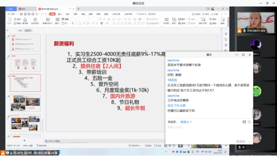 蘇州倉鼠人力資源部經理從企業愿景、自我定位、服務區分布、廣告投放、企業對接、客戶需求和經營狀況全面介紹公司的發展情況。她還展示了部分優秀員工和員工成長培養體系,衷心地表達歡迎外國語學院學子加入公司的熱情與期待。會中,她針對同學們有關招聘崗位要求、福利待遇等問題逐一進行解答。