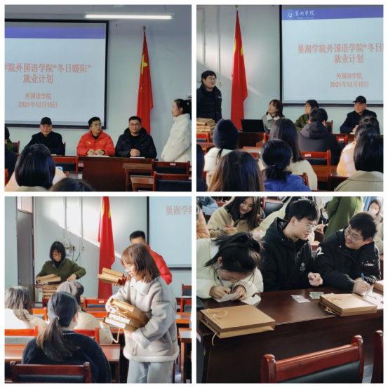 外國語學院黨委書記單自華首先作開場發言。單自華引導同學們在做職業選擇時要充分結合自身興趣愛好,發揮特長做自己喜歡的事情;拓寬就業渠道途徑,發揮主觀能動性,遇到合適的招聘工作時,要大膽敢于嘗試;同時求職過程中要注意識別就業詐騙陷阱,提高自身安全意識。單自華鼓勵即將參加研究生考試的同學,在關鍵的黃金階段,務必要查漏補缺、夯實理論知識,同時也要注意休息、調整心態、減壓減負,以樂觀的心態迎接考試,預祝大家旗開得勝,心想事成。18級考研學生代表田地和徐匡耀分享了近期的復習狀況、目標院校和職業規劃,并表示對學院和“冬日暖陽”就業計劃活動的衷心感謝,在關鍵階段更加堅定了考研信心。輔導員張園園、李玲和方磊給所有與會同學發放“冬日暖陽”就業計劃大禮包,表示冬日里的慰問和祝福,同學們在卡片上寫上了考研和就業心愿,以更加昂揚自信的姿態投入到后期的學習、實習和工作之中。