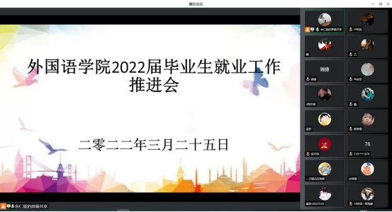 為有效推進2022屆畢業(yè)生就業(yè)工作,使廣大學生了解當下的就業(yè)形勢和就業(yè)政策,同時幫助畢業(yè)生解答就業(yè)相關問題,外國語學院于4月1日召開2022屆畢業(yè)生就業(yè)工作推進會。本次會議由輔導員張園園和余仁能共同主持,會議采用線上方式進行,外院369名畢業(yè)生參加會議。
