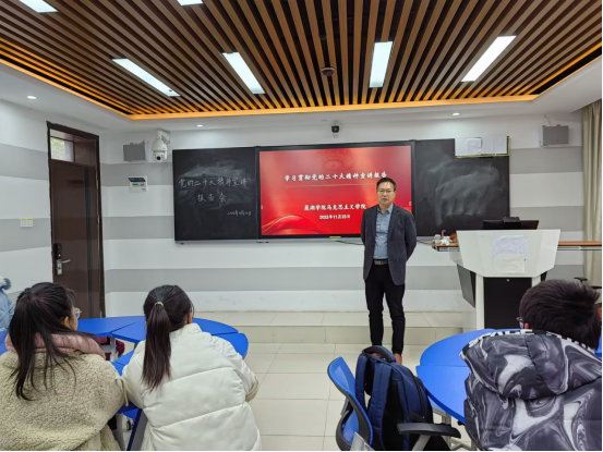 為深入學習宣傳貫徹黨的二十大精神,用黨的二十大精神統一思想和凝聚力量,幫助同學們深入領悟黨的二十大精神,11月30日,校黨委委員、組織部部長柯應根赴22級英語一班宣講黨的二十大精神。