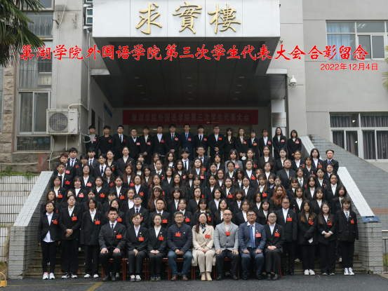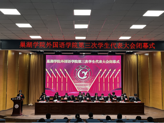 下午16:30,外國語學院第三次學生代表大會閉幕式在求實樓報告廳召開,大會報告選舉計票結果,宣布外國語學院第三屆學生委員會委員當選名單及學生會主席團成員名單,通過《巢湖學院外國語學院第二屆學生委員會工作報告》和《巢湖學院外國語學院學生會章程》的決議。