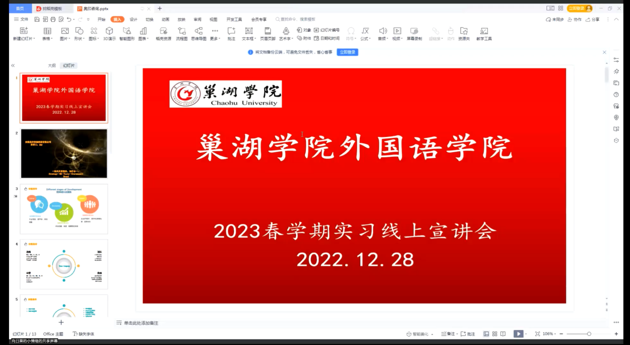 2022年12月28日,外國語學院舉行了春學期畢業(yè)實習線上宣講會,2019級商務英語專業(yè)第二批實習學生參加了本次會議。會議開始,商務英語教研室主任奚偉就春學期實習的內容和意義做了講解,并就同學們關心的問題做了解答。同時對參加實習宣講的四家企業(yè)進行了簡單介紹。