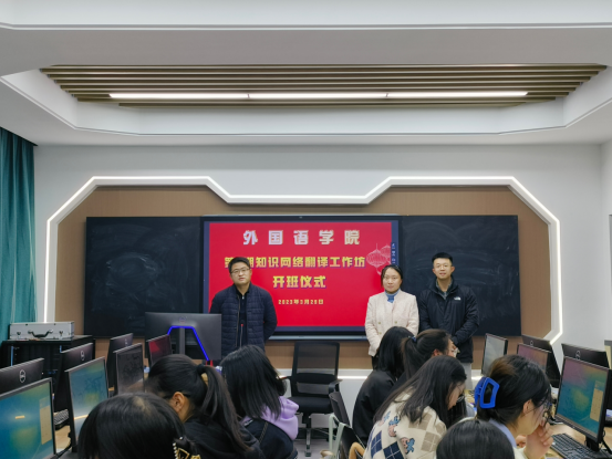 3月29日晚,外國語學院第一期知識網絡翻譯工作坊在博學樓502口譯實驗室開課。開課前,在明德樓商務英語實訓室舉辦了簡短的開班儀式。外國語學院院長余榮琦、副院長余鵬、數字人文與對外傳播研究中心負責人慕媛媛教授及首期學員50余人參加了開班儀式。