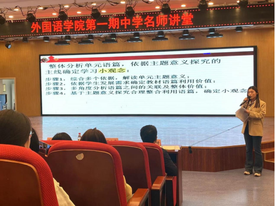 陳露以“大單元教學的解析與范例”為題,分享了課堂教學設計與實踐。從單元整體教學角度出發,把教材邏輯和學習邏輯聯系在一起確定教學邏輯,然后從整體性、遞進性、遷移性三個角度制定單元整體目標,繼而設計單元學習與評估活動等,內容全面富有特色,從真實課堂的情境中展示了教學如何深入展開。