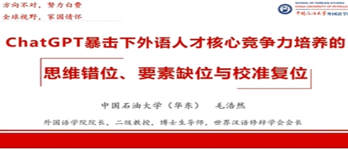 第三場主旨報告“ChatGPT暴擊下外語人才核心競爭力培養的思維錯位、要素缺位與校準復位”來自中國石油大學(華東)外國語學院院長毛浩然教授。報告中就如何 “直面危機,聚焦突圍”提出了一些方法值得我們深思。