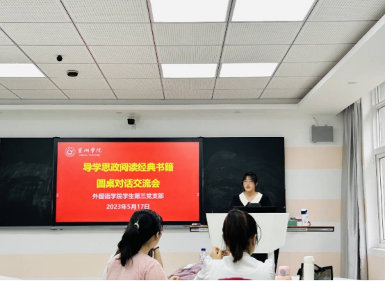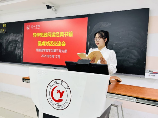 為深入學習貫徹黨的二十大精神,推進學習貫徹習近平新時代中國特色社會主義思想主題教育,培養學生黨員閱讀紅色經典書籍興趣,落實一支部一品牌特色活動,5月17日下午,外國語學院學生第三黨支部第一期“導學思政閱讀經典書籍圓桌對話交流會”在明德樓104智慧教室舉辦,本次活動由支部書記余仁能主持。