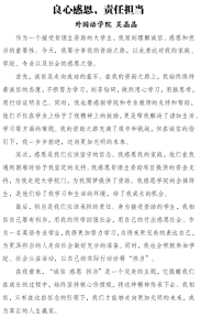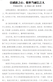 征集原創作品,常懷感恩之心。5月中下旬,外國語學院組織開展“誠信·感恩·擔當”主題原創作品征集活動,學院各年級受資助學生積極參與本次活動,提交征文和書法作品熱情高。作品主題鮮明,內容積極向上,展現了學院學子良好的精神狀態。