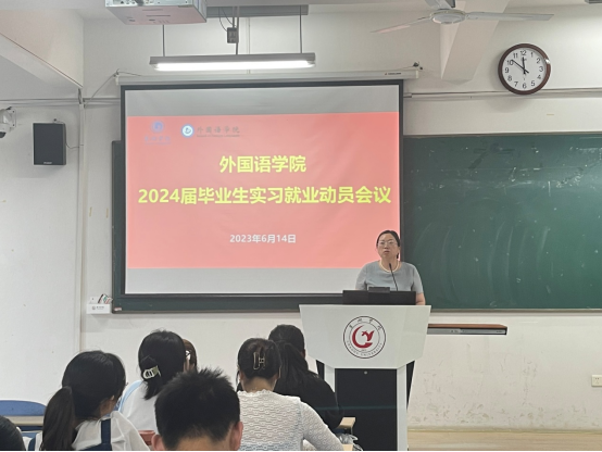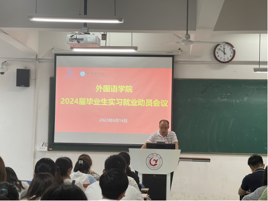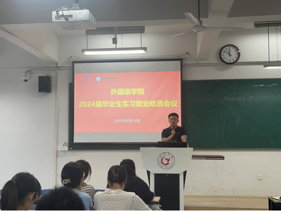 為進(jìn)一步貫徹黨的二十大精神,落實國務(wù)院和上級有關(guān)部門關(guān)于穩(wěn)就業(yè)的決策部署以及學(xué)校有關(guān)學(xué)生實習(xí)工作的各項文件精神,充分調(diào)動學(xué)生參與專業(yè)實習(xí)的主動性和積極性,引導(dǎo)學(xué)生做好實習(xí)前的各項準(zhǔn)備工作,確保學(xué)院學(xué)生實習(xí)工作的有序進(jìn)行,6月14日下午,外國語學(xué)院在慎思樓中301教室召開2024屆畢業(yè)生實習(xí)就業(yè)動員會議。學(xué)院黨委書記張蕊、黨委副書記李磊、副院長余鵬、商務(wù)英語系副主任奚偉、黨委學(xué)生工作部黨委武裝部辦公室秘書張軻、2019級退伍學(xué)生代表陳太龍,以及2020級輔導(dǎo)員李玲出席了動員大會。實習(xí)基地代表科大訊飛、群音信息、雷風(fēng)動力等五家企業(yè)派代表線上線下結(jié)合參加了會議,全體2020級學(xué)生參加了本次動員大會。動員會由余鵬主持。