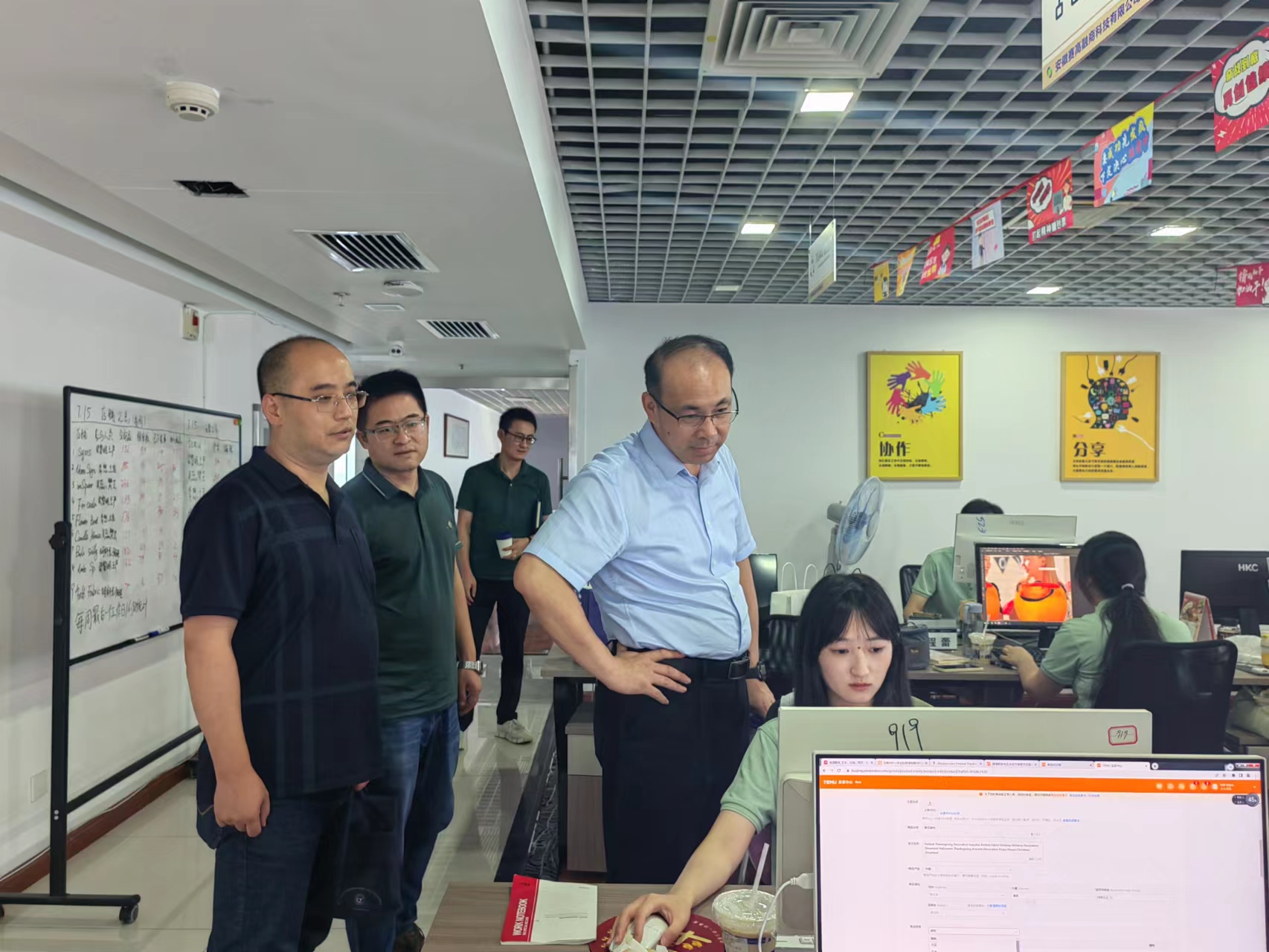 學校一行先后來到中國(安徽)自由貿易試驗區蕪湖片區、蕪湖高新技術產業開發區服務外包產業園,在安徽徽傲電子商務有限公司董事長潘驥風的陪同下,先后走訪了慕晨國際電子商務有限公司、安徽騰帆電子科技有限公司、安徽徽傲電子商務有限公司、蕪湖市賽高電子商務有限公司等多家企業,并看望了2023屆商務英語專業畢業生。