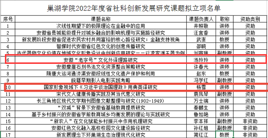 近日,安徽省社會科學界聯合會發布了《關于2022年度安徽省社會科學創新發展研究課題立項的通知》(皖社科聯通字[2023]8號)。外國語學院教師楊雪、湯玲玲申報的課題 “國家形象視域下《習近平談治國理政》用典英譯研究”和“安徽‘老字號’文化外譯理路研究”獲批立項。