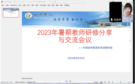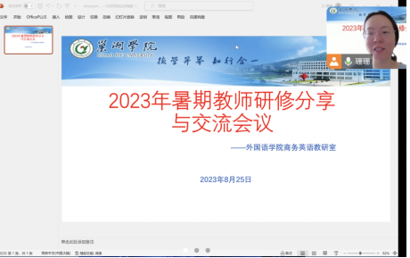 2023年8月25日上午,外國語學院商務英語系組織全體教師線上交流分享暑期研修暨師德師風建設學習心得。商務英語系副主任奚偉,教師代表陳婉柔博士、宋濤做學習心得分享。會議由教研室主任王珊珊老師主持。