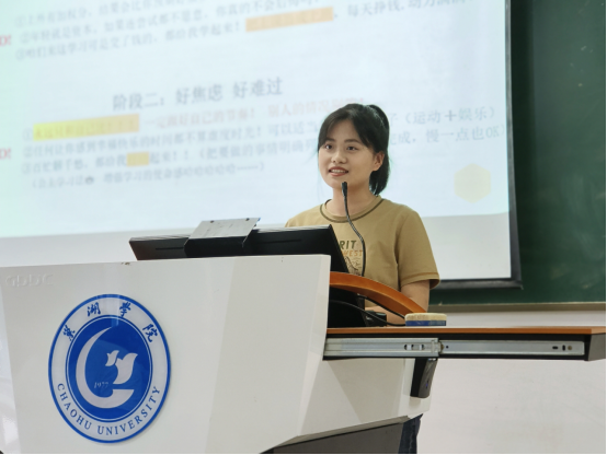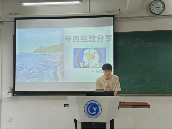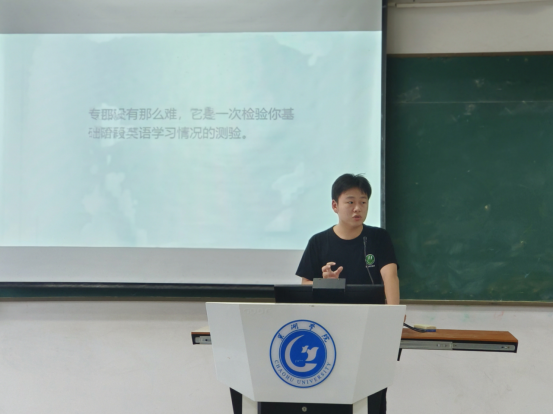 四位同學依次上臺發言,向大家分享了日常備考專四考試的感悟與建議。他們講述了不同階段的學習情況與技巧,介紹了從準備階段到應試階段,從英語聽力、英語詞匯、語法、作文及閱讀部分的考點難點及考試注意事項。他們分享了很多有益的學習經驗,比如使用英語學習軟件提高自身聽力水平,學會循序漸進;勤于練習,貴在堅持;注重詞匯積累,把功夫花在平時,充分利用英語專業書籍,形成有效的學習方法;鍛煉思辨能力,在英語寫作中靈活應用。四名同學的精彩分享,贏得了同學們的陣陣掌聲,給同學們帶來了一場學習經驗的豐富盛宴。