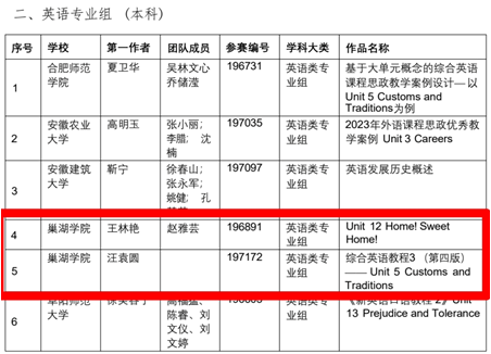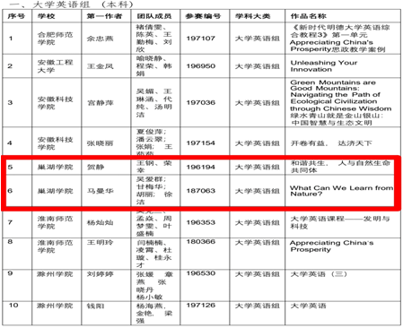 近日,安徽省外國語言文學學會公布了安徽省(本科)外語課程思政活動決賽環節的入圍名單。經過第一輪線上篩選,全省本科高校共有16件作品入圍安徽省(本科)外語課程思政案例評選活動的第二輪線下評比。學院共有4項課程思政教學案例進入安徽省決賽,入圍數量位居第一。其中賀靜團隊和馬曼華團隊進入大學英語組決賽,王林艷團隊和汪袁圓團隊進入英語專業組決賽。