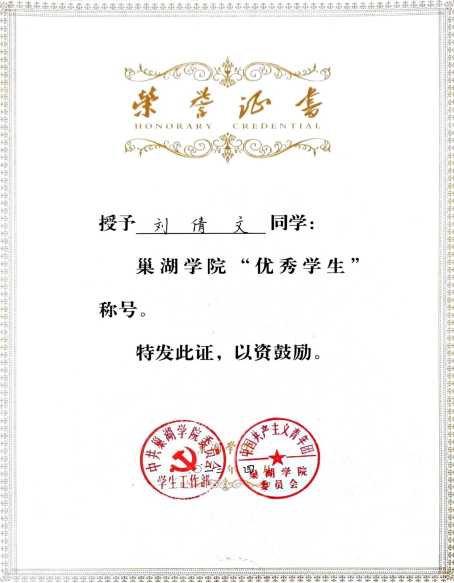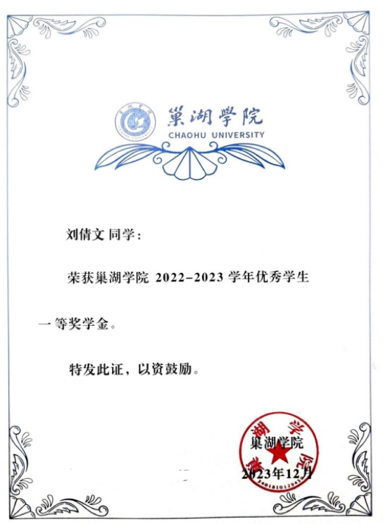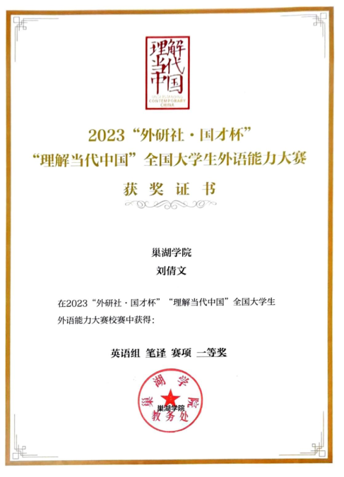 劉倩文,女,漢族,2002年7月出生,中共黨員,巢湖學院外國語學院2020級英語(師范)四班學生。曾獲得巢湖學院一等獎學金兩次,二等獎學金一次,優秀學生稱號兩次,2022年安徽省大學生國際貿易綜合技能大賽省三等獎,2022年“外研社·國才杯”筆譯賽項校一等獎,安徽省優秀畢業生。