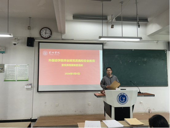 為營造安全、文明、健康、溫情的校園畢業季氛圍,引導畢業生堅守初心夢想、強化責任擔當,進一步加強畢業生黨員的先進性教育,發揮學生黨員在畢業離校過程中的先鋒模范作用。5月8日下午,外國語學院在慎思樓中102教室開展畢業生文明離校安全教育活動,學院各學生黨支部書記及全體畢業班黨員參加活動,學生第四黨支部書記方磊主持。