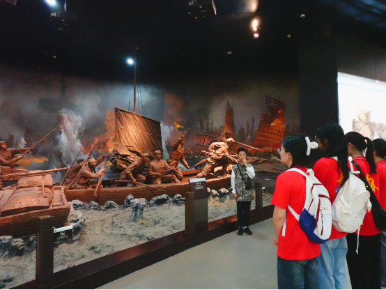 7月11日上午,實踐團隊前往渡江戰役紀念館。渡江戰役紀念館區,由南至北依次為勝利塔、勝利廣場、總前委群雕和紀念館主館、解放廣場。宏偉的建筑無不展現輝煌的氣勢。走進渡江戰役紀念館總館,跟隨著講解員的腳步,團隊成員依次參觀了紀念館的六大展廳。講解員的精彩講解、展廳內的革命文物和藝術群雕以及當年的珍貴影像,向參觀者生動地再現了百萬雄師橫渡長江天塹的壯闊場景,展現了一幅氣勢磅礴、場面恢宏的戰爭歷史畫卷。渡江戰役是中國近代史上的一個偉大的勝利,它孕育了以“堅定信念、敢于勝利、軍民團結、革命到底”為核心內容的革命精神。在參觀的過程中,團隊成員深切感受到革命先輩們的雄才大略和不怕困難、奮勇向前的革命精神。