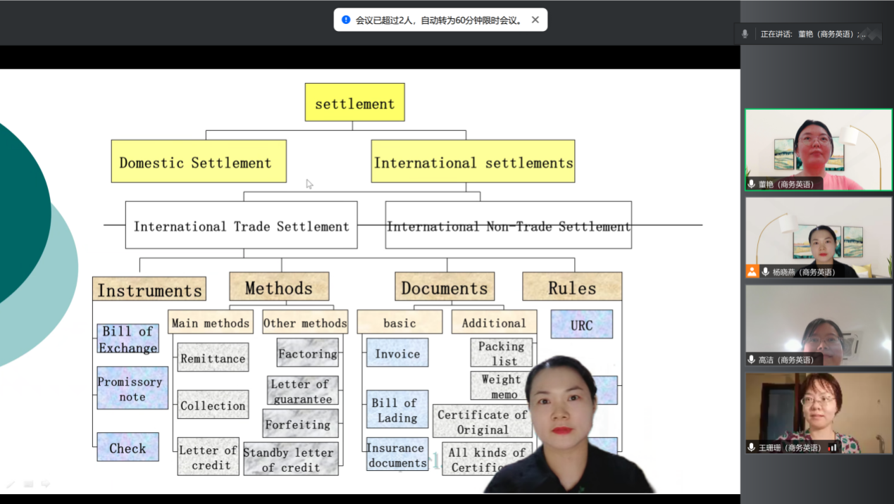 8月24日下午,商務(wù)英語課程二組在騰訊會(huì)議線上平臺舉行教學(xué)展示活動(dòng)。本次公開課是楊曉燕老師主講的《國際支付與結(jié)算》,課程深入解析了國際支付與結(jié)算的核心概念、最新趨勢及實(shí)操技巧。
