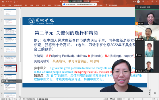 8月27日,語言文化課程組在線舉辦《高級商務(wù)英語》教學(xué)展示活動(dòng)。這次公開課由陳國君老師主講,共有4位老師參與聽課并進(jìn)行點(diǎn)評。本次公開課旨在探討如何在高等教育中有效開展高級商務(wù)英語教學(xué)。陳國君從課程設(shè)計(jì)、教學(xué)方法和學(xué)生評估等多個(gè)角度進(jìn)行了詳細(xì)分享。
