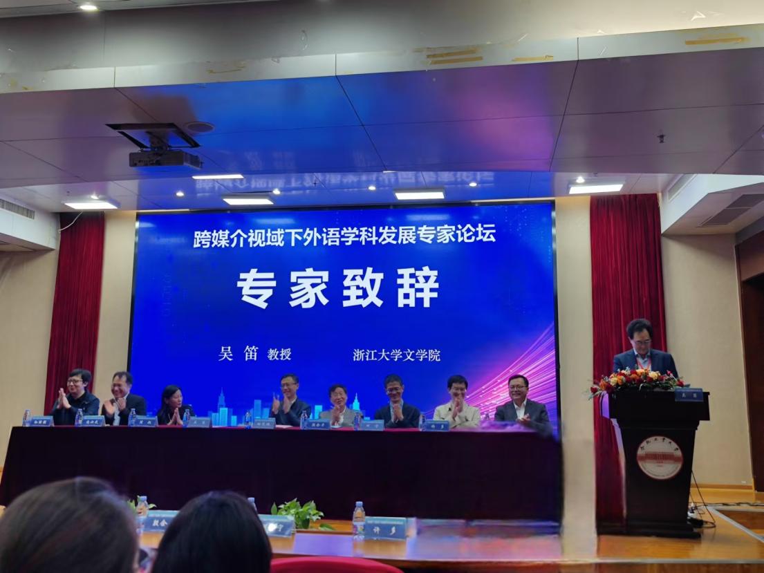 本次會議探討了跨媒介視域下外語學科的發展趨勢、挑戰與機遇。浙江大學吳笛教授、杭州師范大學殷企平教授、周敏教授、上海交通大學尚必武教授、復旦大學鄭詠滟教授、南京師范大學許多教授、蘇州大學孫繼強教授、合肥工業大學胡作友教授分別作專題報告,發言涉及外國文學經典的跨媒介傳播及其文本變異、AI文學的前景展望、媒介生態學與世界文學的重構、跨媒介的故事講述、知識建構與傳播中跨語際實踐和認知能動性的浮現、新文科背景下外語學科區域國別研究、翻譯批評距離與動態調整等具體問題.
