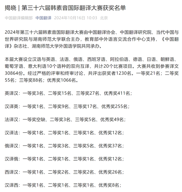 本屆大賽由中國(guó)翻譯協(xié)會(huì)、中國(guó)翻譯研究院、當(dāng)代中國(guó)與世界研究院與湖南師范大學(xué)聯(lián)合主辦,共收到參賽譯文30864份。經(jīng)過(guò)嚴(yán)格的評(píng)審和終審討論,共評(píng)選出1230名獲獎(jiǎng)?wù)摺?/span>