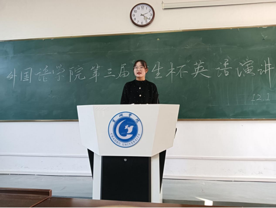 比賽伊始,主持人致開場白并對在場的評委及參賽人員表示熱烈歡迎,宣布比賽正式開始。隨后,參賽選手圍繞“探索現(xiàn)代化之道 擔偉大復興之責”主題,以演講的形式,表達對祖國的熱愛之情,激發(fā)同學們干事創(chuàng)業(yè)的奮斗熱情,擔起新青年的責任與擔當。評委程艷老師和周建華老師就選手的表現(xiàn)進行總結(jié)點評,對所有參賽選手給予鼓勵與期望,希望同學們在演講中融入更多情感,加強鍛煉口語能力,提高英語演講水平。