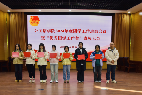 李磊宣讀外國語學院團委2024年度優秀團學工作者表彰人員名單,劉柳等28名同學榮獲優秀團學工作者榮譽,學院為優秀團學工作者獲獎代表頒發榮譽證書。