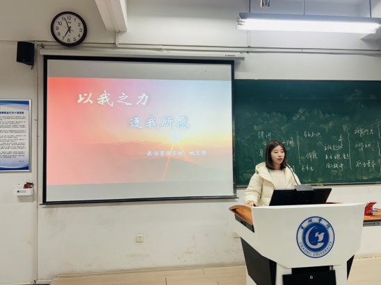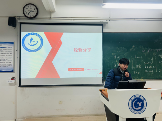 為幫助2024級(jí)新生明確職業(yè)目標(biāo),深刻認(rèn)識(shí)大學(xué)階段的規(guī)劃方向,深化學(xué)生黨員的先鋒模范作用,充分發(fā)揮朋輩輔導(dǎo)引領(lǐng)作用,打造學(xué)風(fēng)建設(shè)系列支部共建品牌特色活動(dòng),12月17日,外國(guó)語(yǔ)學(xué)院聯(lián)合旅游管理學(xué)院在慎思樓北302教室組織開(kāi)展“講我所‘獎(jiǎng)’”優(yōu)秀學(xué)子學(xué)習(xí)經(jīng)驗(yàn)分享交流會(huì),本次活動(dòng)邀請(qǐng)到冷若雨、姚文靜、杜長(zhǎng)龍和劉子陽(yáng)四名學(xué)生黨員作學(xué)習(xí)經(jīng)驗(yàn)分享交流,本次活動(dòng)由輔導(dǎo)員余仁能主持。