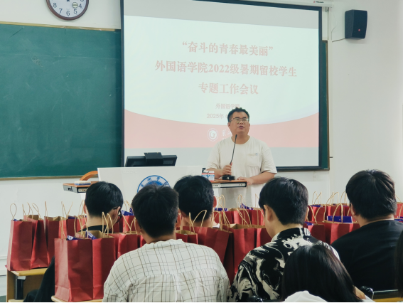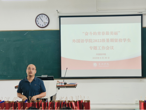 為進一步加強暑期留校學生的教育管理服務工作,強化暑期留校學生安全防范意識,提高大學生思政教育的精準性,6月30日上午,外國語學院召開暑期留校學生教育管理專題工作會議。外國語學院院長余榮琦、黨委副書記李磊和全體暑期留校學生參加會議,本次會議由2022級輔導員余仁能主持。