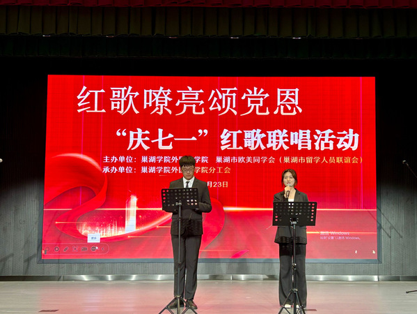 為慶祝中國共產黨成立104周年,傳承紅色基因,弘揚愛國主義精神,豐富校園文化生活,日前,由外國語學院和巢湖市歐美同學會共同主辦、外國語學院分工會承辦的“慶七一”紅歌聯唱活動在大學生活動中心禮堂隆重舉行。學院師生齊聚一堂,用嘹亮的歌聲表達對黨的深情祝福,展現新時代青年的精神風貌。本次活動邀請了巢湖市委統戰部副部長孫語琪、統戰部綜合科工作人員王新蕾、巢湖市歐美同學會副會長張苗苗、崔雁濤出席。