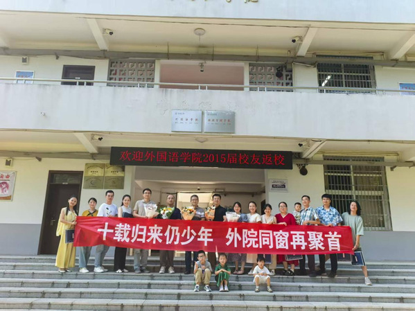 7月19日,外國語學院2015屆英語(師范)專業部分校友懷揣著對母校的思念與牽掛,重返校園,共同開啟畢業十周年聚會之旅。這場跨越十年時光的重逢,不僅是校友們重敘同窗情誼的契機,更是一次為學院發展建言獻策的重要交流。