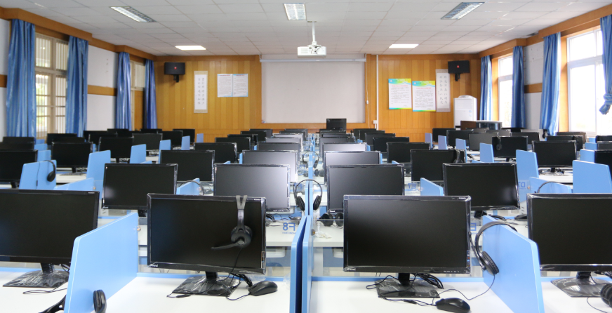 外國語學院綜合實驗室成立于2015年,實驗室總面積近500平方米,設有口譯實訓室、商務英語綜合實驗室和4間語音實訓室,共6間實訓室。4間語音實訓室分別為明德樓中205(第一)、中305(第二)、中405(第三)語音室和位于電教中心的第四語音室,承接了英語語音、英語聽力、英語視聽說、商務英語視聽說、英語口語等一系列課程。