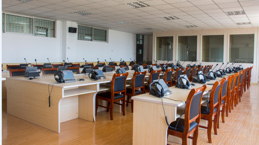 口譯實驗室于2015年9月投入使用,采用了國內一流的同聲傳譯會議、訓練系統。配有2個同聲傳譯譯員間(4個譯員席)、1個主控臺、44個代表席和1個發言席。所有代表席席位根據需求可以設置成譯員席,實現同聲傳譯。全部席位均配有高音質耳機以及麥克風,同時配有高分辨率的投影供演示使用。該實驗室具有實現同傳會議、口語和口譯考試及系統管理等功能,可實現不同的教學模式和等訓練模式;同時還可以舉辦小型會議和模擬會議。