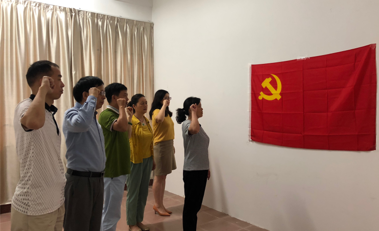 宣誓在莊嚴肅穆的氛圍中開始,全體黨員在領誓人呂家云的帶領下,面向鮮艷的黨旗,高舉右手,再次莊嚴宣誓:“我志愿加入中國共產黨,擁護黨的綱領,遵守黨的章程,履行黨員義務,執行黨的決定,嚴守黨的紀律,保守黨的秘密,對黨忠誠,積極工作,為共產主義奮斗終身,隨時準備為黨和人民犧牲一切,永不叛黨。”鏗鏘恢宏的誓詞,強烈震撼著在場的每一位黨員,一字一句,神圣而豪邁,體現了黨員同志們對中國共產黨的無限忠誠。