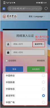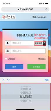 (1)所有教職工在辦公區、教學樓上網,在輸入工號后,選擇“巢湖學院”網絡出口;
