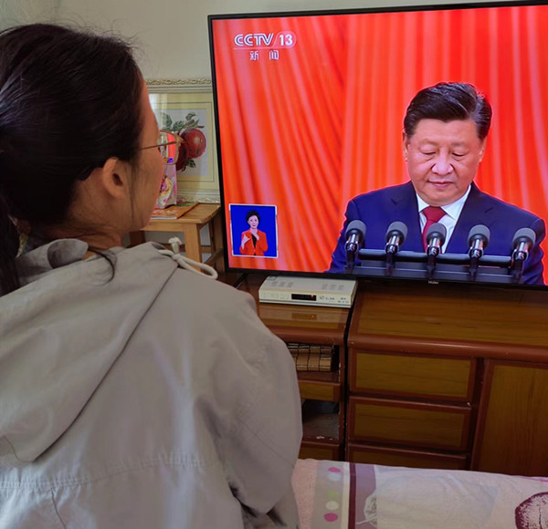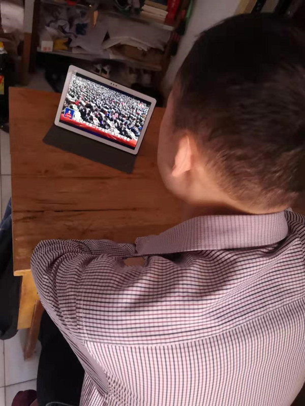 支部入黨積極分子史淑仙支部黨員王宏衛觀看黨的二十大開幕會直播。(文/原博  /由個人提供  /陳立鋼)