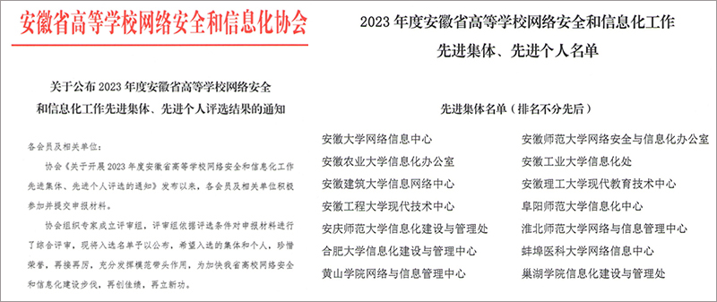 近日,安徽省高等學校網絡安全和信息化協會下發《關于公布2023年度安徽省高等學校網絡安全和信息化工作先進集體、先進個人評選結果的通知》,巢湖學院榮獲“2023年度安徽省高等學校網絡安全和信息化工作先進集體”。