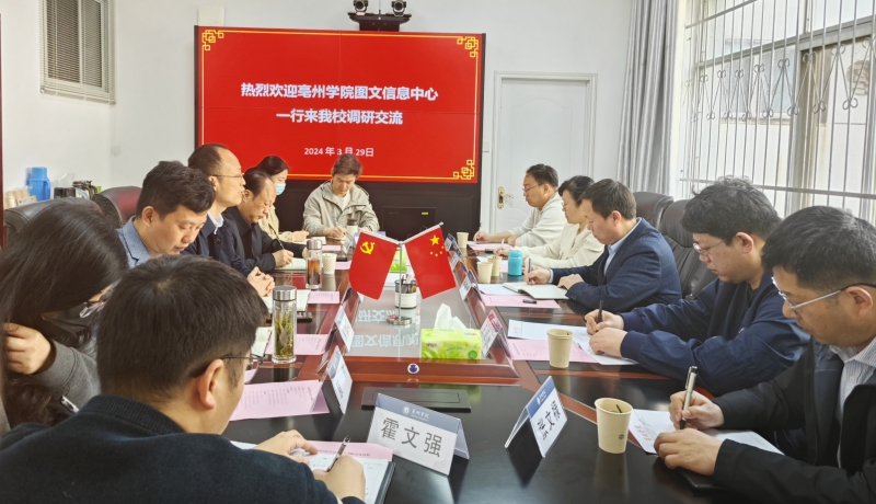 3月29日上午,亳州學(xué)院圖文信息中心副主任朱錦龍一行五人來(lái)我校調(diào)研交流信息化建設(shè)工作。巢湖學(xué)院圖書(shū)館館長(zhǎng)魯文勝、信息化處副處長(zhǎng)侯加兵及相關(guān)工作人員參加調(diào)研交流會(huì),會(huì)議由信息化處處長(zhǎng)陳立鋼主持。