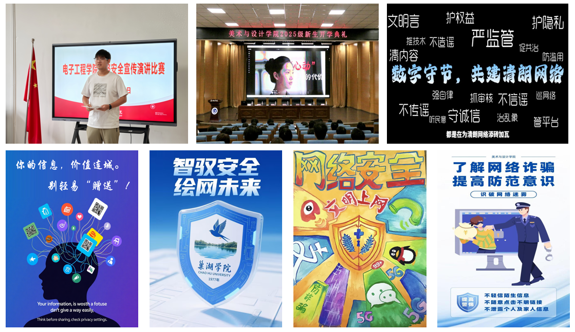 學校構建“線上線下”立體宣傳矩陣,線下在教學樓、廣場等人員密集區域,布設網絡安全宣傳展板、發放宣傳手冊,利用校園多媒體顯示屏全天候滾動播放宣傳標語及防電信網絡詐騙視頻,并在廣播站同步開設“網絡安全宣傳周”專欄,播放《中華人民共和國網絡安全法》《中華人民共和國個人信息保護法》等法律法規,讓網絡安全知識在校園內隨處可聞、觸手可及;線上依托校園網主頁、“易班?今日校園”App以及學校官微、公眾號等平臺,持續推送網絡安全宣傳教育信息,同步上線“巢湖學院網絡安全宣傳專題網”,動態更新國家網絡安全宣傳周相關信息。宣傳周期間,系列宣傳教育活動遍及全校近兩萬名師生,營造了濃厚的網絡安全氛圍,顯著增強了師生的安全意識與防護技能。