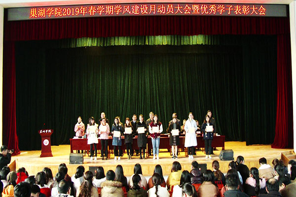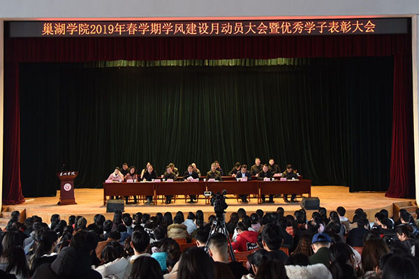 為構建學風建設長效機制,進一步選樹典型,發揮朋輩的榜樣引領作用,凝聚共識,同心協力,營造良好育人氛圍,3月6日下午,巢湖學院在大禮堂隆重召開2019年春學期學風建設月動員大會暨優秀學生表彰大會。副校長徐柳凡、紀委書記阮愛民出席會議。校學風建設領導組成員,各學院分黨委副書記、副院長,全體專兼職輔導員,教師代表和學生代表1000余人參加會議。大會由阮愛民主持。