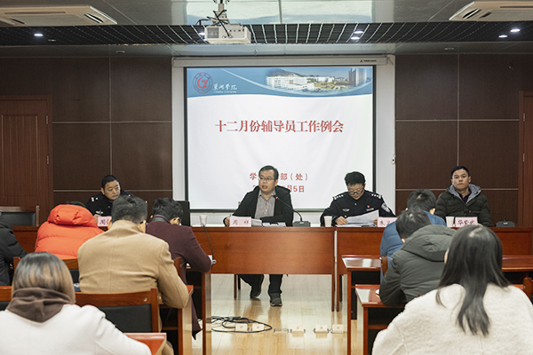12月5日上午,學工部在第二會議室召開十二月份輔導員工作例會。安巢經開區公安分局國保大隊大隊長朱衛波,民警周青松,學工部部長周祥、副部長華紫武,全體專兼職輔導員參加會議。會議由周祥主持。