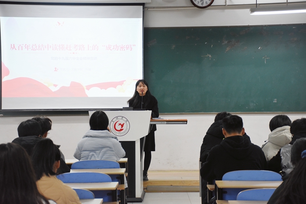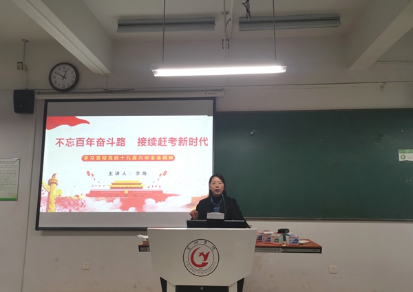 經(jīng)法學院李陳老師以《不忘百年奮斗路,接續(xù)趕考新時代》為主題開展宣講。她以梳理歷屆中央全會主題為切入點,詳細介紹了十九屆六中全會概況,從為什么要總結(jié)黨的百年奮斗的重大成就和歷史經(jīng)驗、解讀《決議》內(nèi)容、青年學生應(yīng)該如何從《決議》中汲取奮進力量幾個方面展開,號召大家從百年黨史中深刻感悟中國共產(chǎn)黨立志實現(xiàn)中華民族偉大復(fù)興的初心使命。