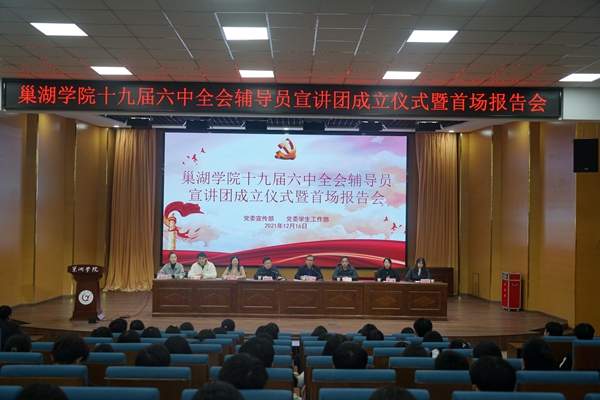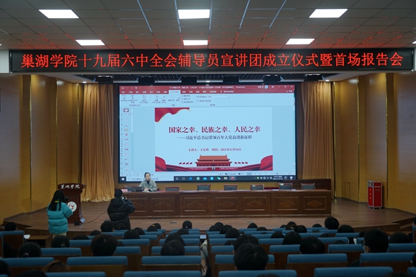 為深入學習宣傳貫徹黨的十九屆六中全會精神,在巢湖學院大學生中掀起學習全會精神、凝聚奮進力量的熱潮,根據(jù)學校黨委統(tǒng)一部署,黨委宣傳部、黨委學工部遴選李本祥、孫圓圓、王安琪、李陳、湯重、伍兵等六名優(yōu)秀專職輔導員組成黨的十九屆六中全會精神輔導員宣講團。自12月16日至12月27日,宣講團成員深入12個二級學院面向全體大學生開展面對面、互動式宣講活動共24場,覆蓋學生4000多人次,用“青言青語”將全會精神講明白、講生動、講透徹。