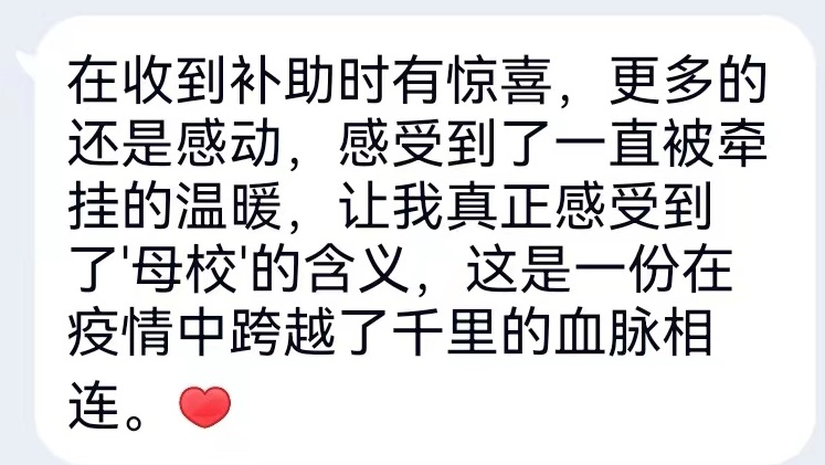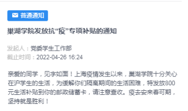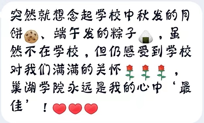 “收到補助時有驚喜,更多的還是感動,感受到了一直被牽掛的溫暖,讓我真正感受到了‘母校'的含義,這是一份在疫情中跨越了千里的血脈相連。”“突然就想念起學校中秋發的月餅、端午發的粽子,雖然不在學校,但仍感受到學校對我們滿滿的關懷,巢湖學院永遠是我的心中‘最佳’!”收到專項補助后,在滬同學們紛紛留言感慨。