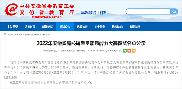 2022年安徽省高校輔導員素質能力大賽共設置基礎知識測試、案例研討、談心談話3個項目,采取選手線上作答、專家線上評審的方式進行。共有來自全省各高校的90名輔導員參賽,經過3個項目的比拼,我校輔導員孫圓圓以扎實的理論素養和業務知識,和對學生特征、學生成長成才規律的熟知把握,以及對學生的教育引導、答疑解惑能力,順利脫穎而出。